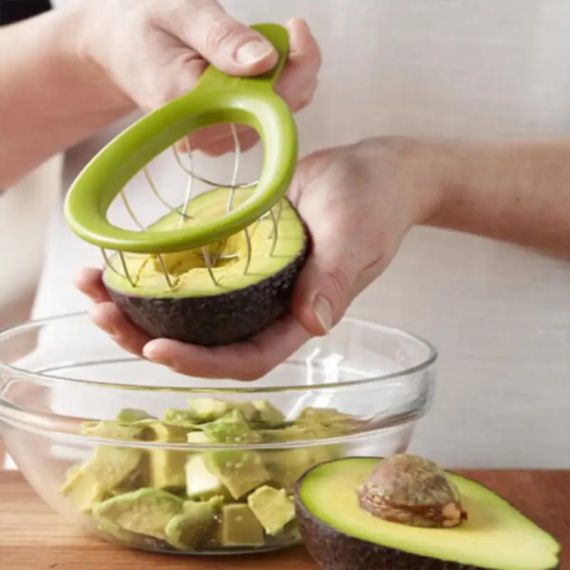Lihtne kasutada. Joondage pool avokaadot, vajutage alla, pöörake ja tõstke üles. Tugevad roostevabast terasest traadid lõikavad viljaliha puhtalt läbi.